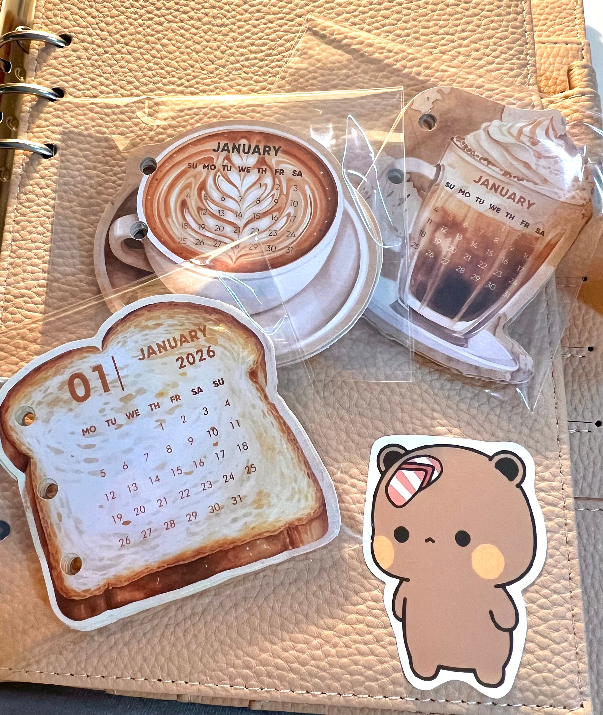 Niedliches Café und Toast/ Kuchen Design , so kannst du dir einen kleinen Kalender immer dahin heften wo du ihn brauchst . 12 Kartons mit Kalender Druck .