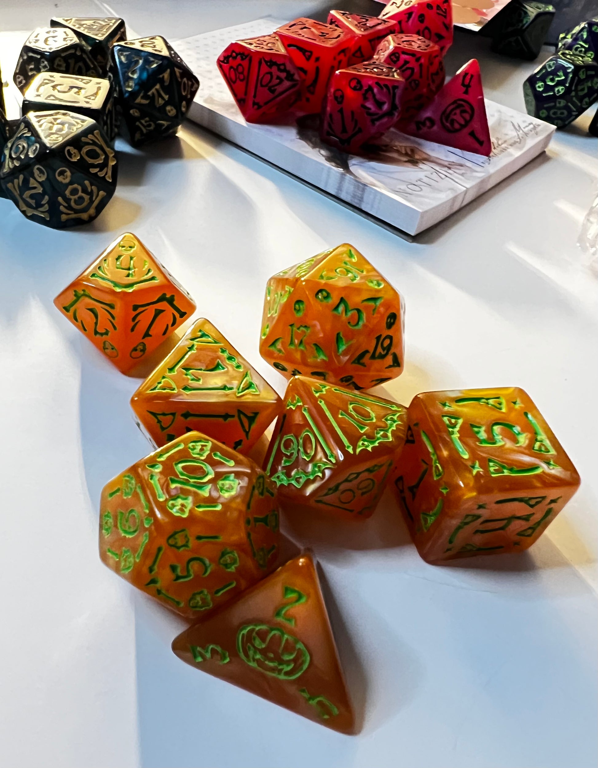 7 teiliges Epoxy Würfelset in Orange mit Spinnweben Muster und leichtem Metallic Glanz